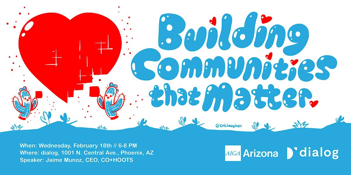 Building Communities that Matter is an AIGA Arizona conversation about what makes creative communities last. Jaime Munoz, CEO of CO+HOOTS, will open the evening with a talk on why community matters, how shared purpose fosters belonging, and why consistency is essential.