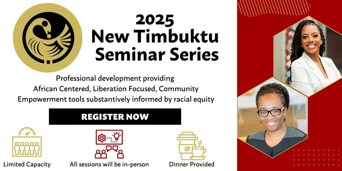 The purpose of the New Timbuktu Community Education Institute is to provide high quality professional development that is based on and draws from methodologies that are derived from the bodies of work and community based institutions that have traditionally been marginalized. These seminars will provide a variety of African Centered, Liberation Focused, Community Empowerment tools that are substantively informed by racial equity. These tools are useful particularly for individuals who are building new Black-led institutions or seeking solutions to strengthen, protect, and sustain existing ones.