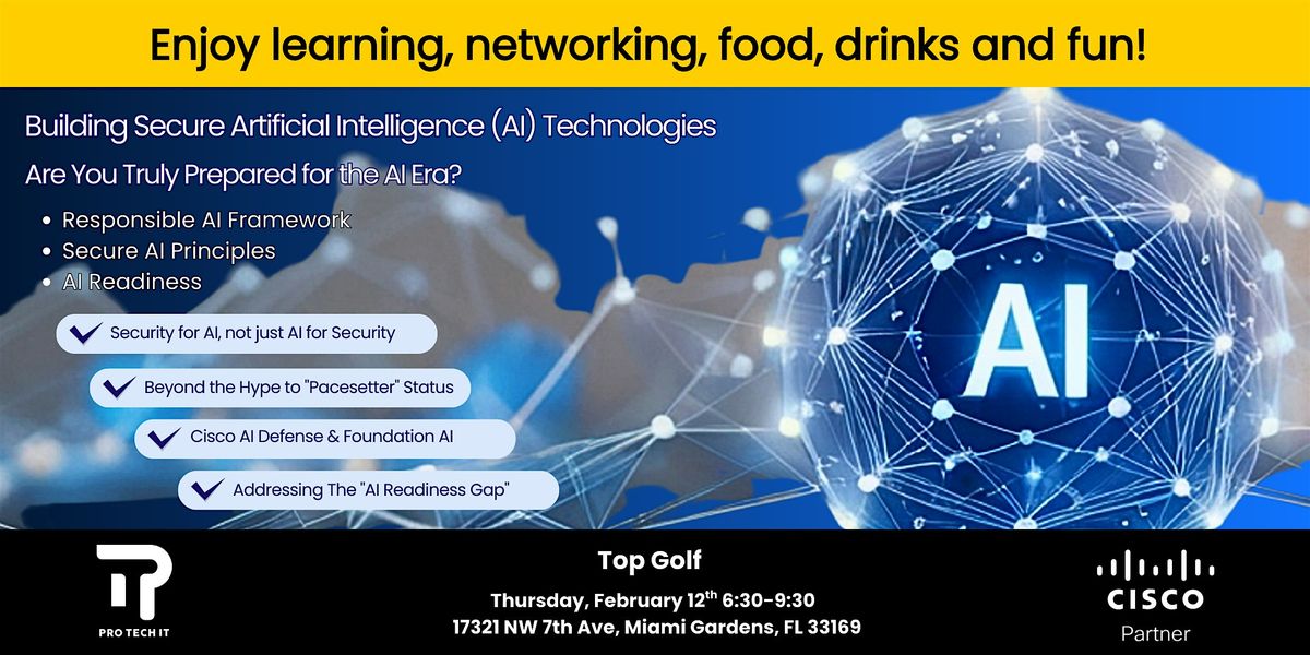 Get ready for an engaging, in-person event hosted by ProTech IT Group and Cisco, designed specifically for industry professionals focused on keeping AI secure in today’s enterprise environments.