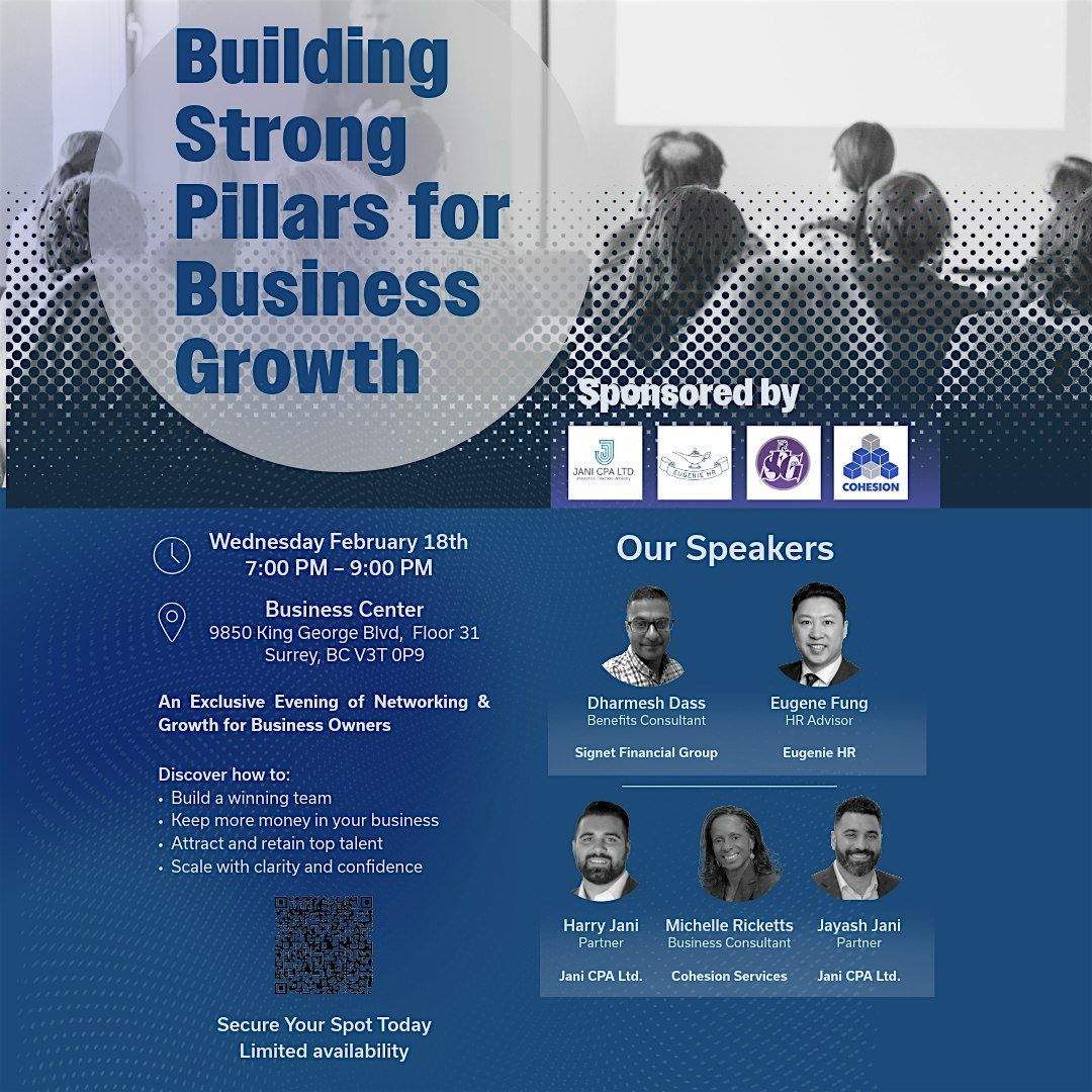 Building Strong Pillars for Business Growth is an in-person evening focused on networking and learning the key fundamentals that drive a successful business. This event is designed for owners who want to move from potential to consistent performance and long-term growth.