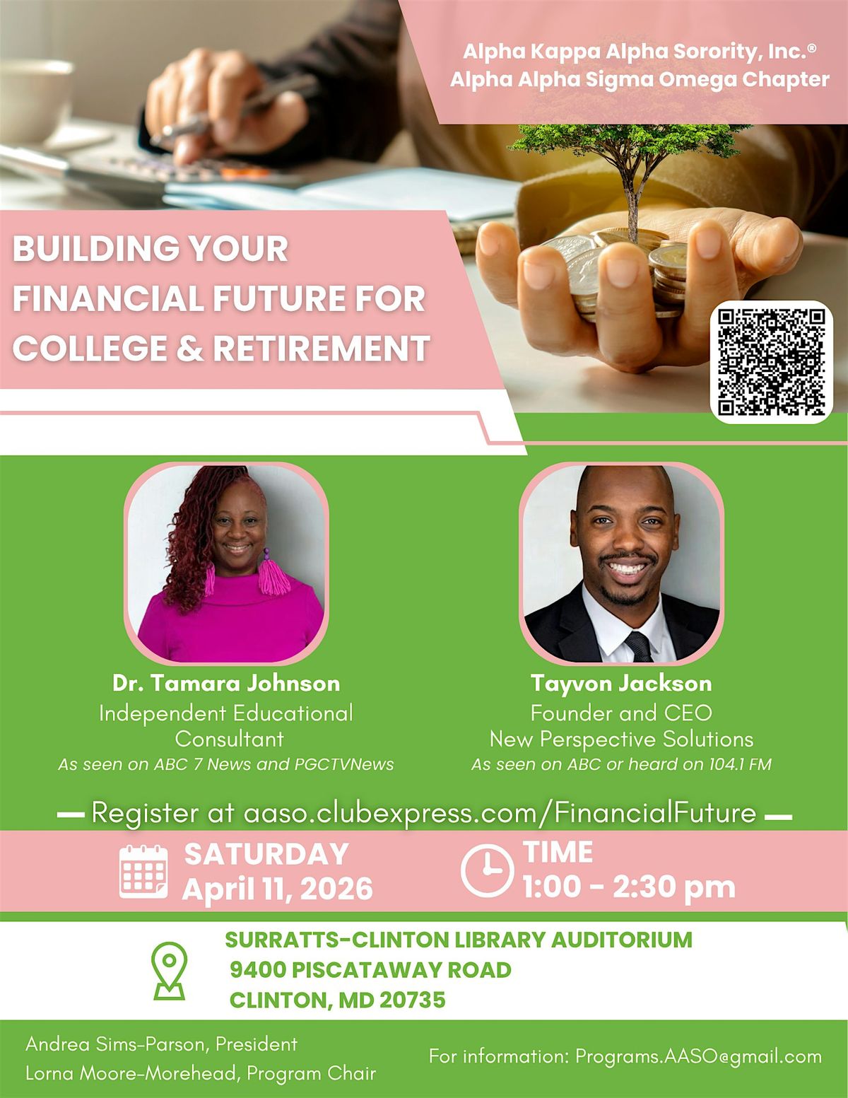 Alpha Alpha Sigma Omega Chapter invites you to attend Building Your Financial Future for College & Retirement, an engaging and practical event designed to help individuals and families make smarter financial decisions for the future.
