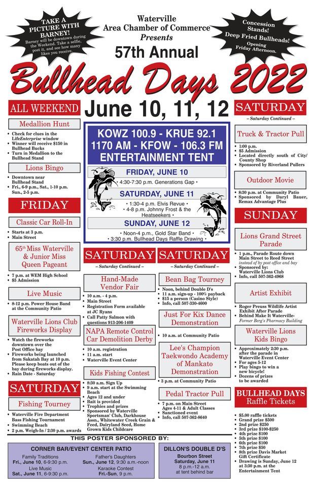 Join us for the 57th Annual Bullhead Days in Waterville, MN June 10-12th, 2022! See our list of events: