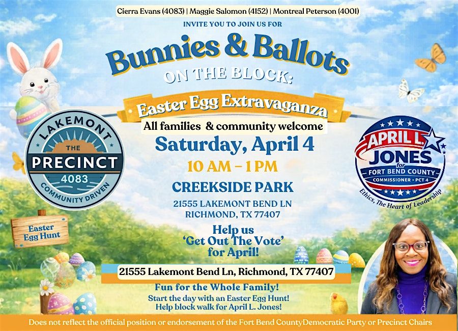 Join us for a fun, family-friendly Easter Egg Hunt and Community Block Walk in support of April Jones as she runs in the upcoming runoff election for Fort Bend County Commissioner, Precinct 4.