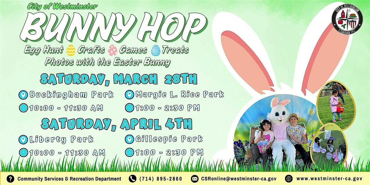 Join us at our local parks for some egg-citing Spring time fun! Families will enjoy a variety of fun filled activities including games, crafts, music, photos with the Easter Bunny, and more! Egg hunts will be held throughout the event for children ages 12 and under.