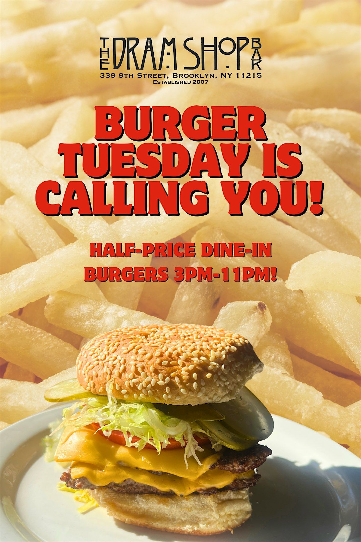 Enjoy Brooklyn's best burger for 1/2 the price every Tuesday. Available only for dine-in or takeout. Happy Hour until 6pm.