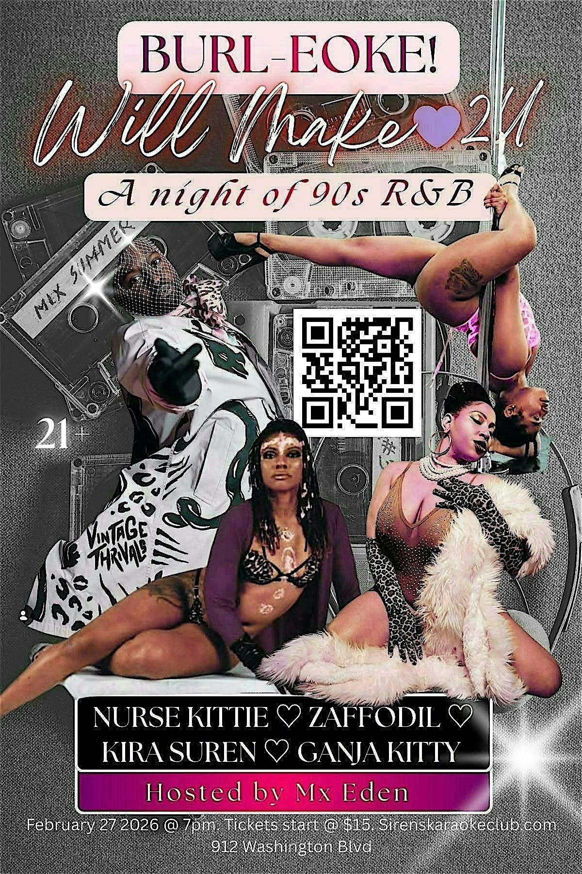 This month's theme is "Will Make Love 2u" R&B songs from the 90s! Featuring your favorite burlesque and pole dancers- Kira, Ganja Kitty, Zaffodil, and Nurse Kittie.