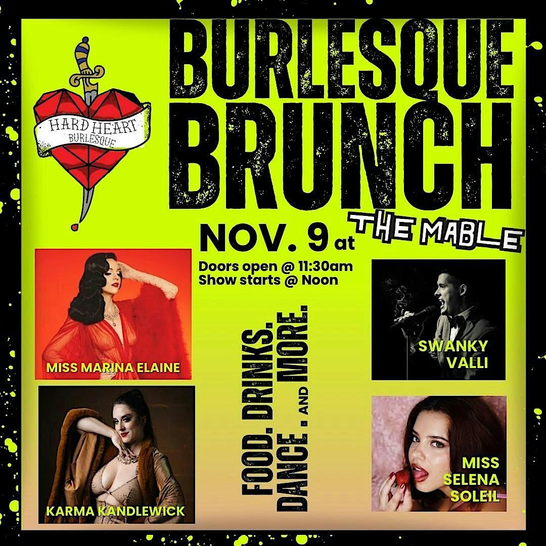 Get ready for a boozy, bawdy brunch like no other! Swanky Valli emcees the afternoon with smooth vocals and sharp wit, while burlesque bombshells Karma Kandlewick, Miss Marina Elaine, and guest Selena Soleil turn up the heat with sultry, sparkling performances.