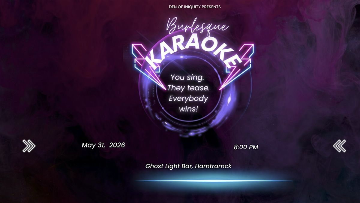 You, the audience, can sign up to sing from our Master Karaoke List. Some of Detroit's best burlesque performers dance along - and they won't know the song until you tell them! We'll also have a few songs in between things, a lot of fun, and a special performance from our featured artist!