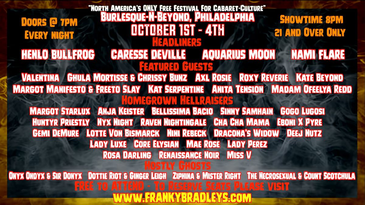 Join us, Friday, October 3rd 2025 as we present the 19th annual celebration of all things Burlesque and all things Beyond - Philadelphia! North America's only free festival for cabaret culture returns to B. West and Franky Bradley's, and as we have landed in OCTOBER - we're going full pumpkin-spicy. We are also go-going OUT in Hallow'd Style!