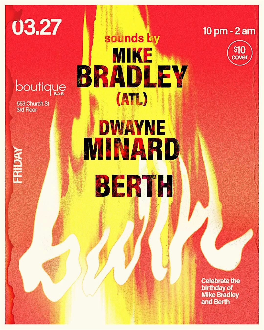 10pm-2am, $10 Cover. Boutique bar 553 Church st.