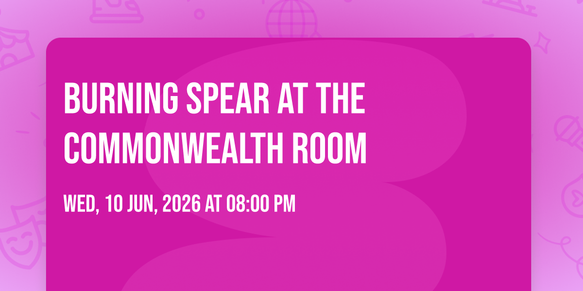 π Welcome to Burning Spear at The Commonwealth Room, where dreams come alive and possibilities are endless! ποΈ Join us at The Commonwealth Room in the heart of Salt Lake City, UT for an event that defies expectations. π On June 10th, 2026 at 08:00 PM, be part of something truly extraordinary as we bring together innovation, entertainment, and pure magic. β¨ Every aspect has been carefully designed to ensure an unforgettable experience for all our guests. Whether you're seeking adventure, inspiration, or simply a break from the ordinary, this event promises to deliver beyond your wildest dreams. π Prepare for a journey into the extraordinary!