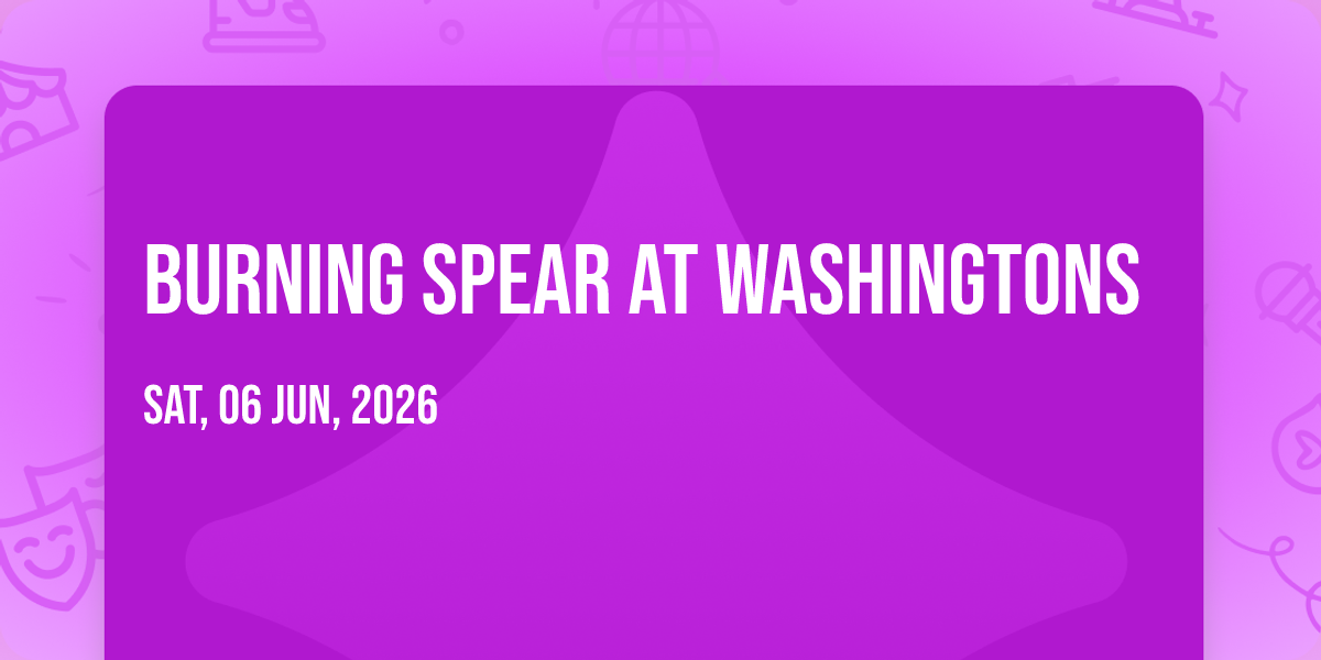 🎉 Welcome to Burning Spear at Washingtons, where dreams come alive and possibilities are endless! 🏛️ Join us at Washingtons in the heart of Fort Collins, CO for an event that defies expectations. 📅 On June 6th, 2026 at 08:00 PM, be part of something truly extraordinary as we bring together innovation, entertainment, and pure magic. ✨ Every aspect has been carefully designed to ensure an unforgettable experience for all our guests. Whether you're seeking adventure, inspiration, or simply a break from the ordinary, this event promises to deliver beyond your wildest dreams. 🎊 Prepare for a journey into the extraordinary!