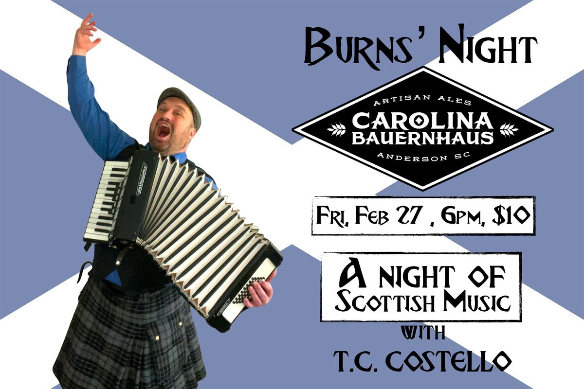 Join us on February 27th as we honor the rich heritage of Scottish culture and the timeless works of Robert Burns. The night will feature a special performance by the talented T.C. Costello, who will bring the spirit of Scotland alive with traditional Scottish music and songs inspired by the works of Burns himself.