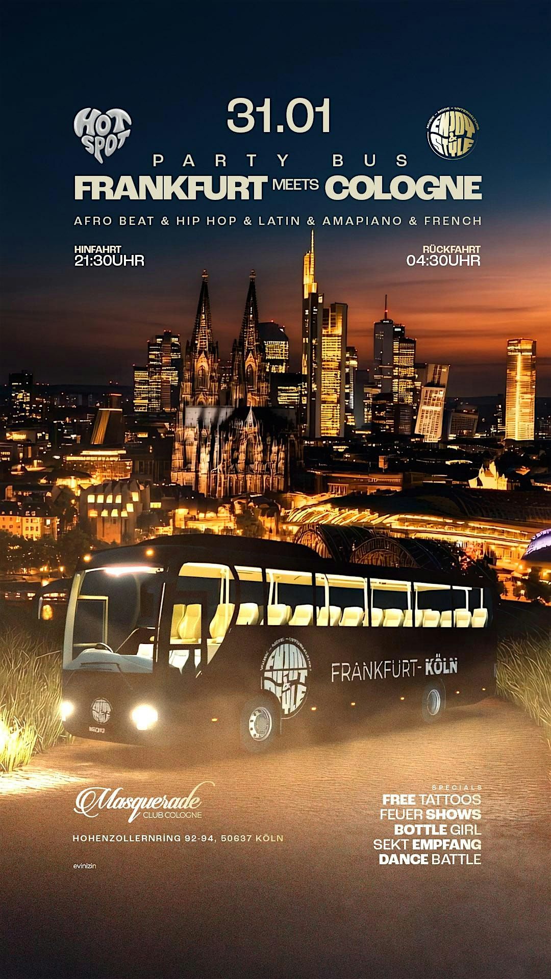 #FrankfurtMeetsCologne #PartyBus #MasqueradeCologne #Afrobeats #Amapiano #HipHopParty #LatinVibes #CologneNightlife #VIPVibes #Hotspot #EnjoyAndStyle