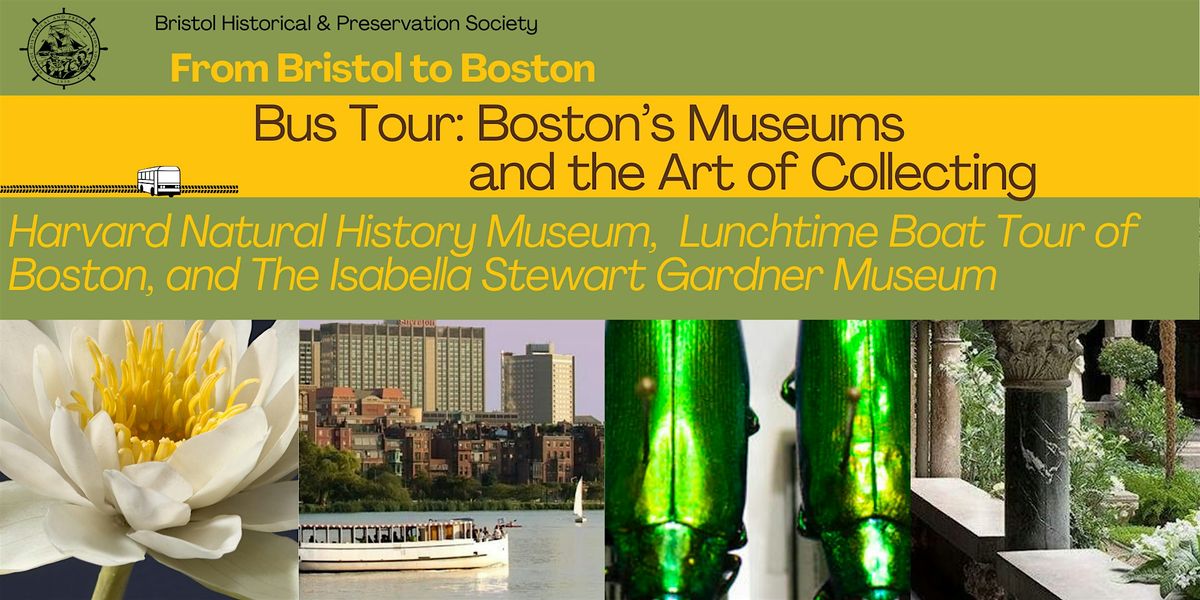 The Bus will depart from the BH&PS Headquarters, 48 Court Street, Bristol at 8am. Parking is readily available in the lot across the street. The bus will return to the BH&PS Headquarters at 6-6:30pm (subject to traffic). Included in ticket price: motorcoach transportation to Boston, admission and tour of the Harvard Museum of Natural History, boxed lunch and boat cruise along the Charles River, admission to the Isabella Stewart Gardner Museum in Boston.
