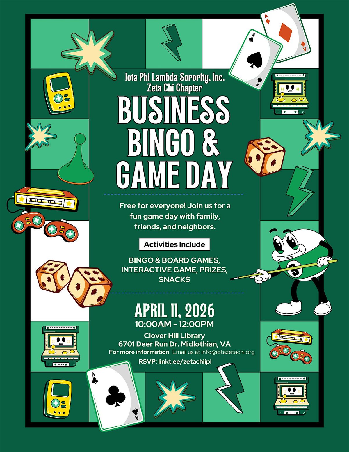 Join the Zeta Chi Chapter of Iota Phi Lambda Sorority, Inc. for Business Bingo & Game Day, a free community event filled with laughter, friendly competition, and prizes.
