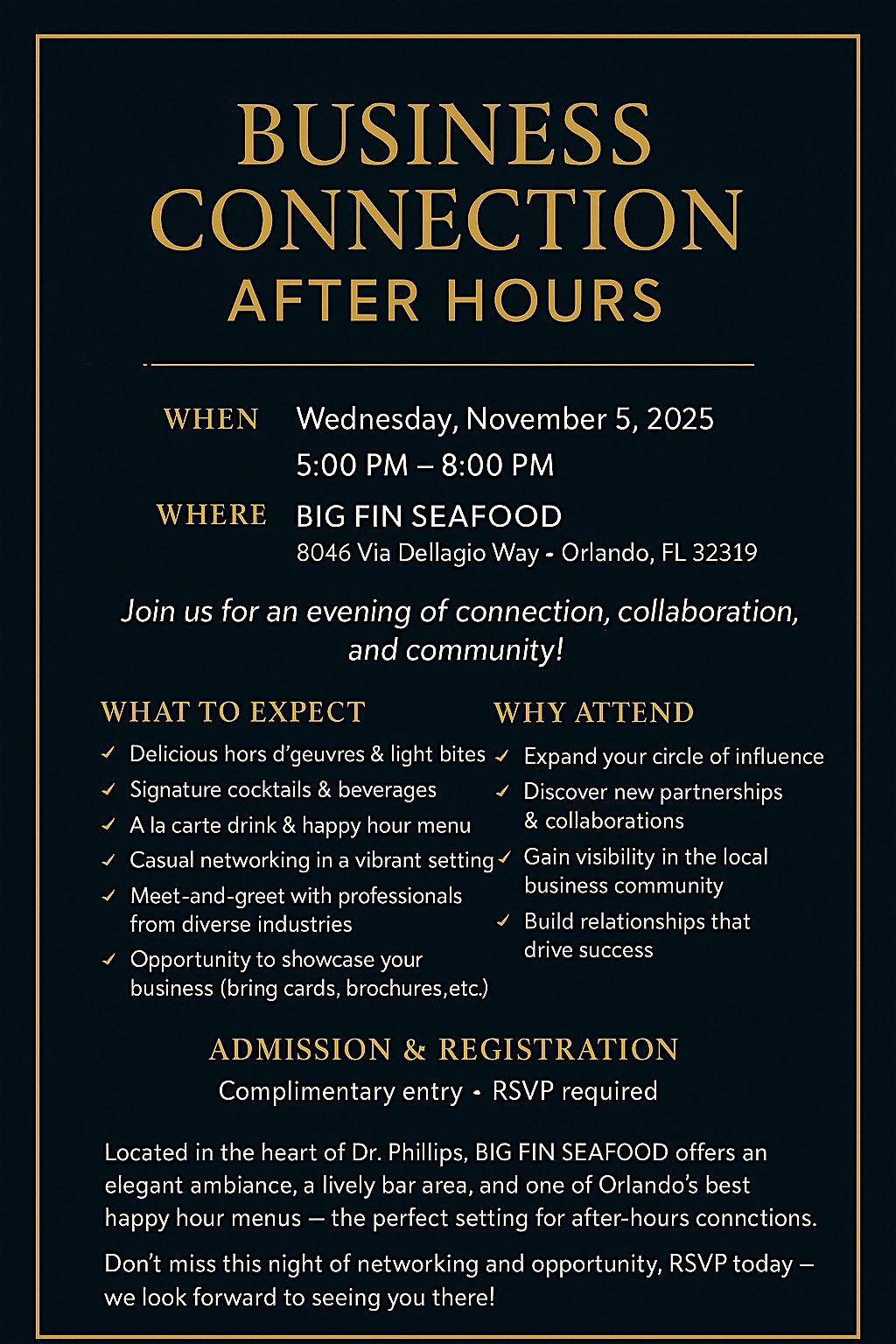 Welcome to the Business Connection & Networking After Hours event! Join us at Big Fin Seafood for an evening of mingling, connecting, and building relationships with fellow professionals. This in-person event is the perfect opportunity to expand your network, exchange ideas, and discover new business opportunities in a relaxed and informal setting. Don't miss out on this chance to make valuable connections and grow your business. See you there!