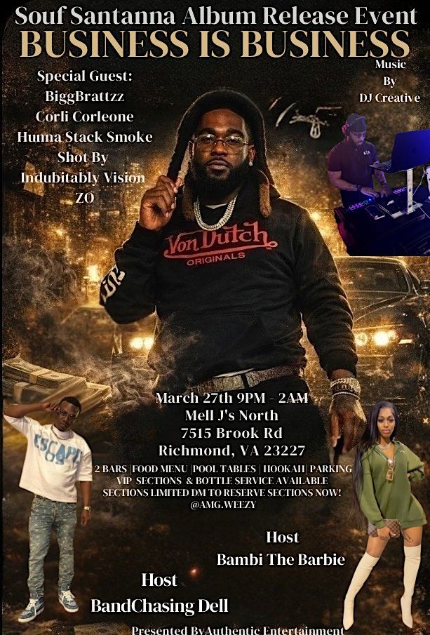 Get ready to celebrate the launch of the brand-new Business is Business album! Join us in person for a night full of great vibes, heavy drip, and awesome company. This is your chance to experience the music up close, with the one and only Souf Santana, and rock out to the latest tracks. Host by Bandchasingdell and Bambi the Barbie. Don’t miss out on this epic event in The Foxhole – it’s gonna be 🔥!