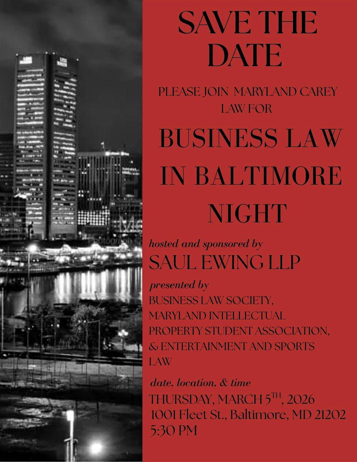 Please join Maryland Carey Law’s Business Law Society, Maryland Intellectual Property Student Association, and Entertainment and Sports Law Society for an evening celebrating Business Law in Baltimore, generously hosted and sponsored by Saul Ewing LLP.