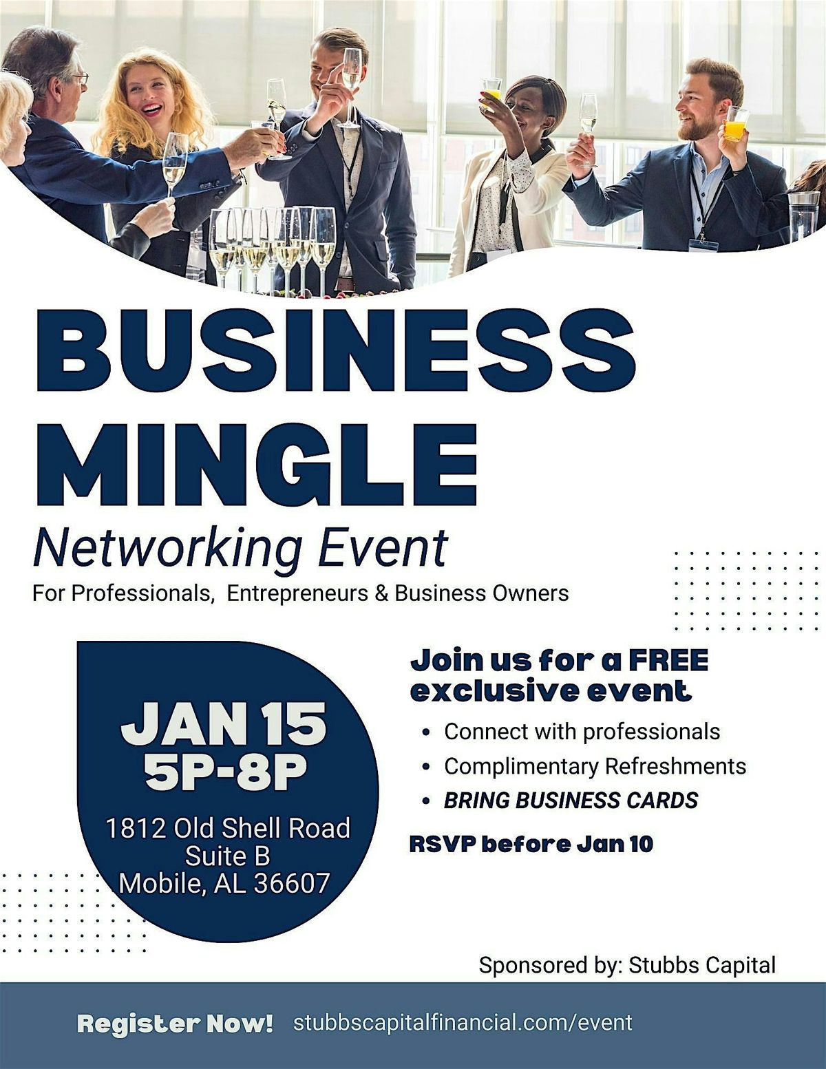 The Business Mingle will be held on Thursday, January 15, 2026, starting promptly at 5:00 PM (Central Time) at the accessible location of 1812 Old Shell Rd.
