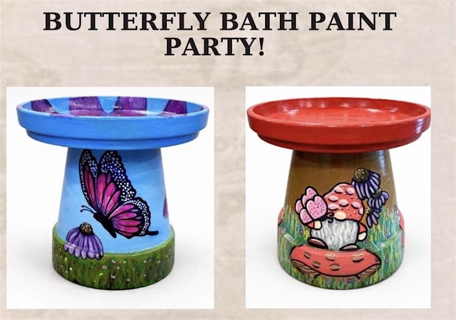 Join us for a relaxing and creative afternoon painting a beautiful butterfly bath- a unique garden feature that will add charm and color to your outdoor space. Choose from two designs or create your own design! Step- by- Step instruction will be provided by Catherine from Catherine's Canvases, making this class perfect for beginners and seasoned painters alike. By the end of the class, you will have your very own hand- painted butterfly bath to take home and enjoy in your garden!