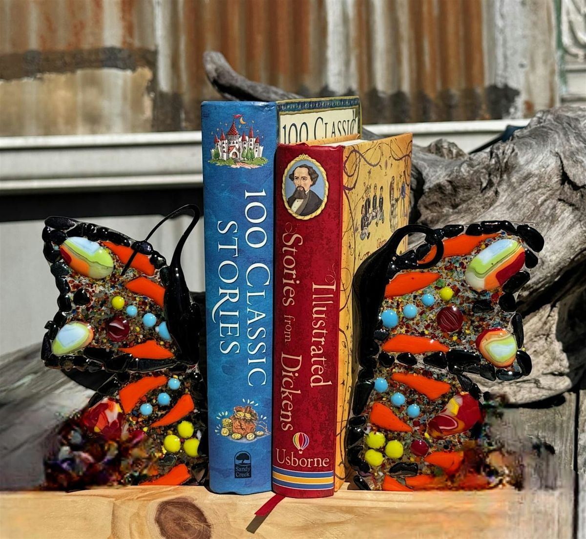 Add colorful fused glass butterflies to your book collection with these one-of-a kind bookends. Full of vibrancy and mixed glass textures, personalize your bookends with favorite colors, creative designs and imagination!