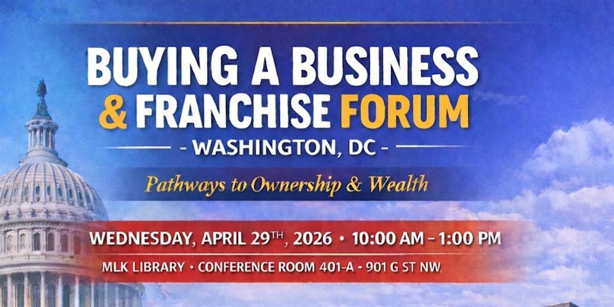 Buying an Existing Business/Franchise & Commercial Real Estate ForumWed. 4/29/26 @ 10amMLK Library Downtown DC901 G St NWConference Rm 401-A