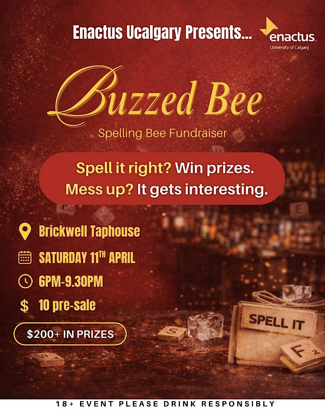 Get ready for a fun night at the Brickwell Taphouse on April 11th, 2026 at 6:00 PM (MDT)! Join us for the Buzzed Bee, the coolest spelling bee hosted by Enactus Ucalgary. Whether you’re here to compete or cheer on friends, expect laughs, friendly competition, and good vibes as well as some prizes!!!