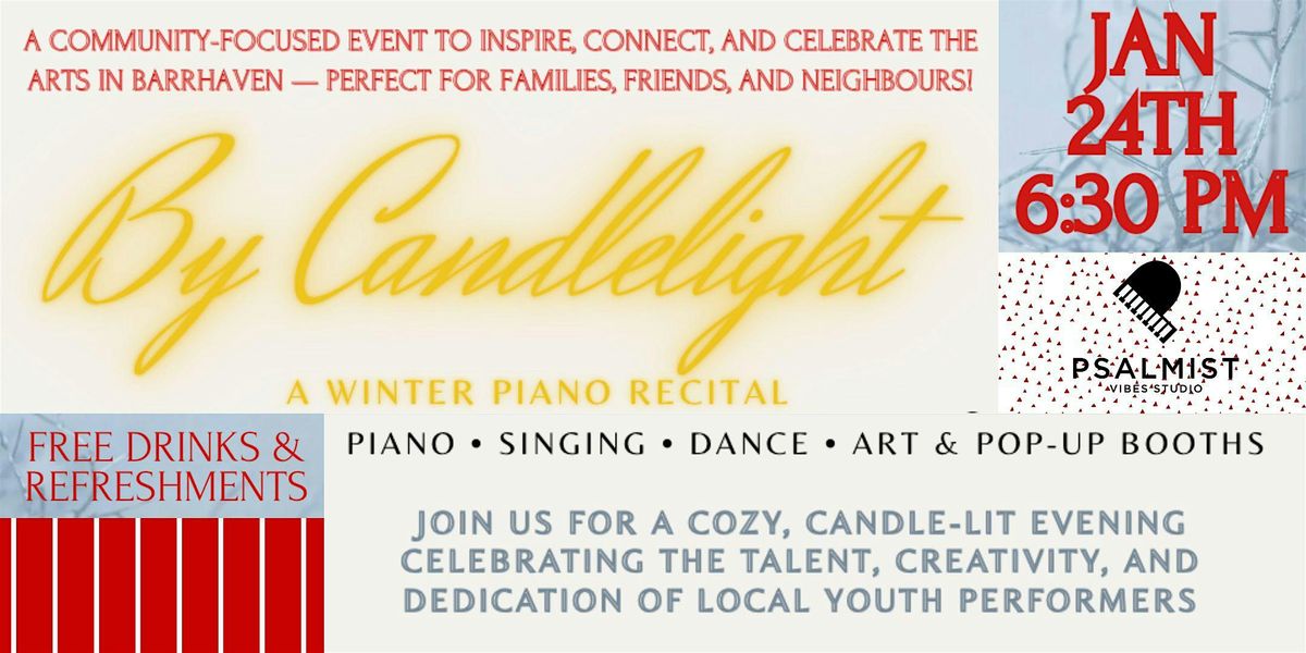 Welcome to By Candlelight: A Winter Community Arts Showcase! Join us at 3013 Jockvale Rd on January 24, 2026 at 6:30 PM (Eastern Time) for a cozy, candle-lit evening of piano, singing, and dance performances, along with art displays and pop-up community booths. Let the creativity and talent of local youth transport you to a winter wonderland as you relax, connect, and enjoy the magic of live performances. Don’t miss this special opportunity to celebrate the arts and the Barrhaven community. See you there!