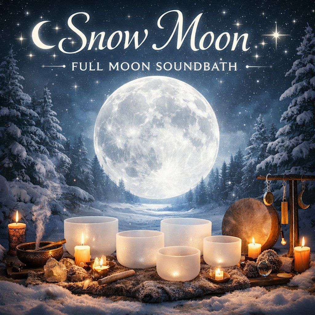 The Snow Moon—named for the quiet, snow-covered stillness of winter—invites rest, reflection, and gentle release. Through crystal singing bowls, chimes, drums, and intuitive sound, you’ll be guided into a meditative state where vibrations wash through the body, melting tension and bringing balance back to mind, body, and spirit.