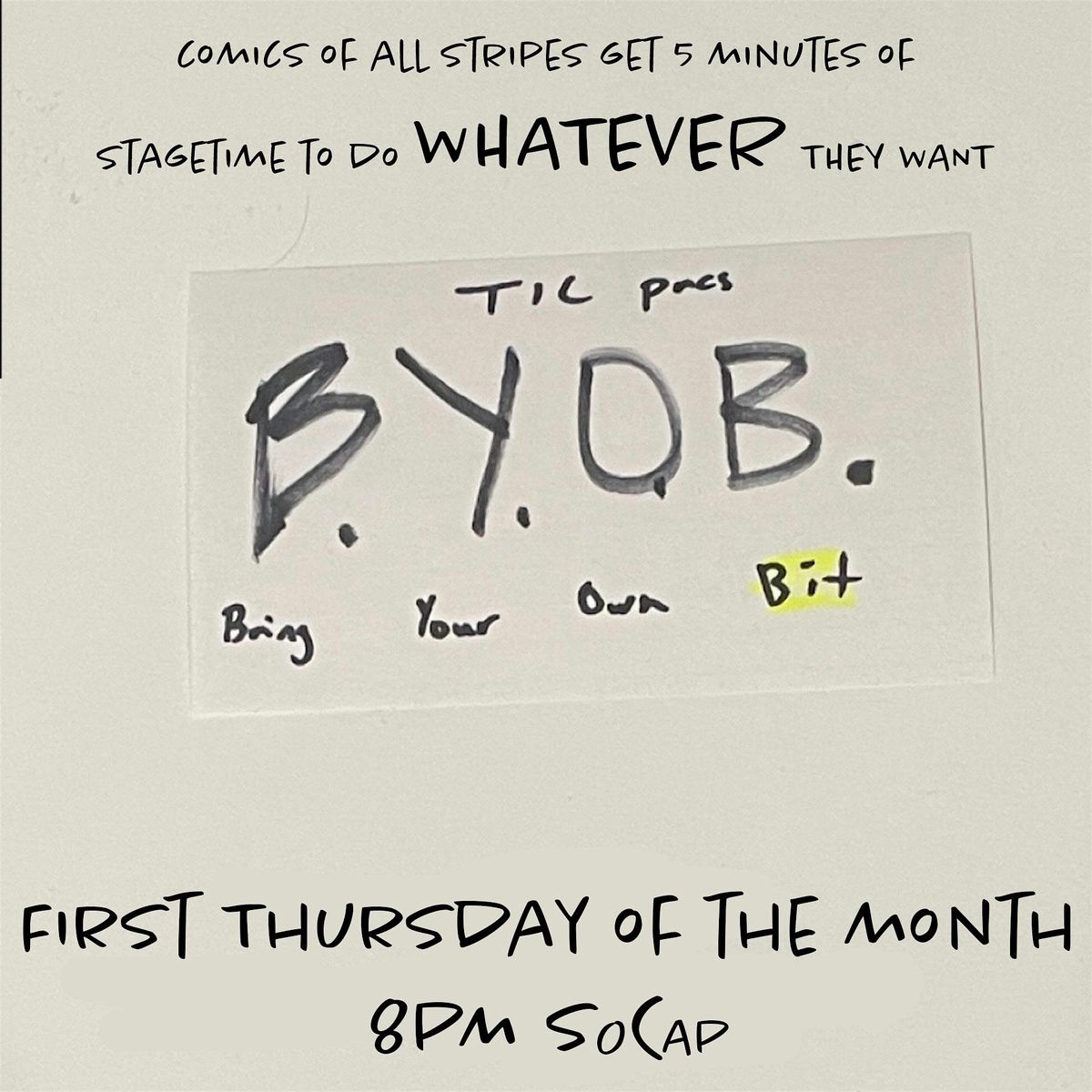 An opportunity for performers to bring their best bit to the stage!Wanna try a new format or improv? Do the dumbest sketch you can think of? Try stand up? You’ve got 5 minutes!See all the chaos unfold!