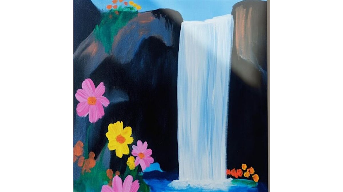 Paint a serene waterfall surrounded by vibrant flowers—sip, unwind, and bring this peaceful scene to life!
