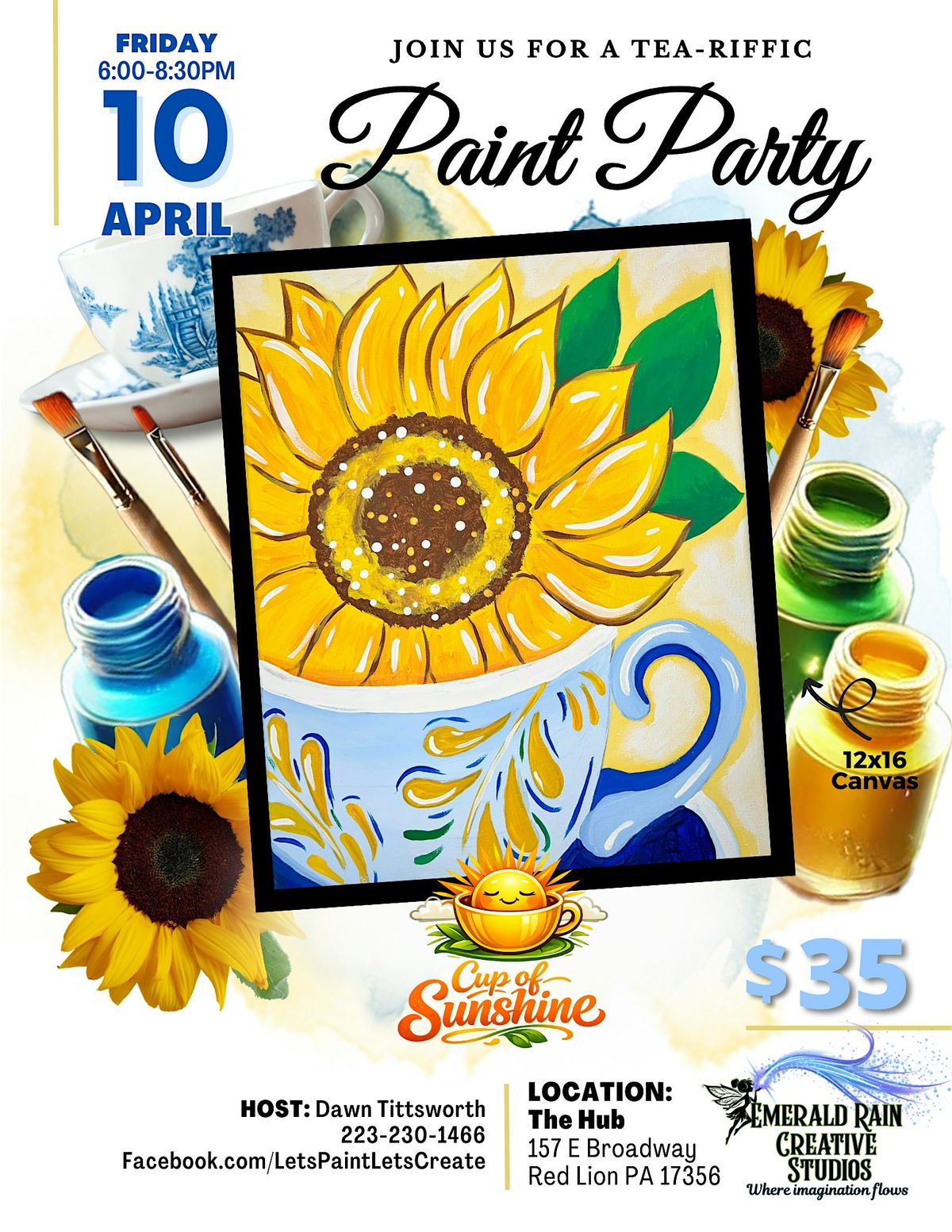 Join us on Friday, April 10th from 6:00–8:30 PM at The Hub (157 E Broadway, Red Lion, PA) for a tea‑riffic Paint Party. We’ll be creating a bright and cheerful Cup of Sunshine on a 12x16 canvas — perfect for all skill levels.