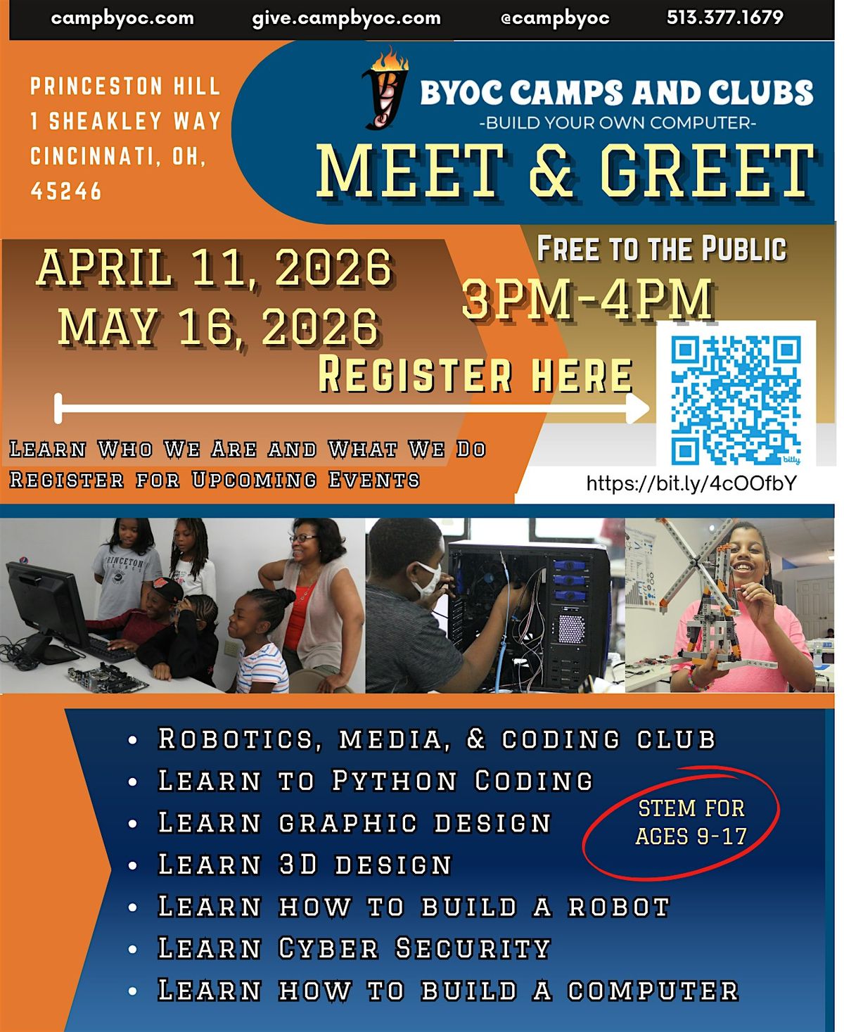 Are you looking for a community that prepares your child for the high-demand world of technology? Join BYOC (Build Your Own Computer) Camps and Clubs for an inviting Meet & Greet! This free event is designed for parents and students (ages 9-17) to learn who we are and what we do.