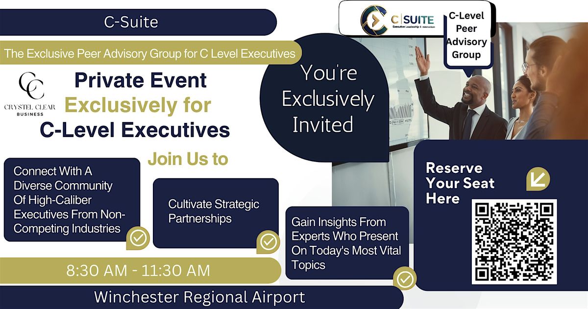 Top of Virginia Regional Chamber and Crystel Clear Business Strategies invite you to a private, exclusive, brief Discovery Meeting to introduce C-Suite: The Dynamic Ecosystem Where C-Level Executives Collectively Address Complex Business Issues, Explore Emerging Trends, and Generate Breakthrough Solutions that Drive Sustainable Organizational Success.