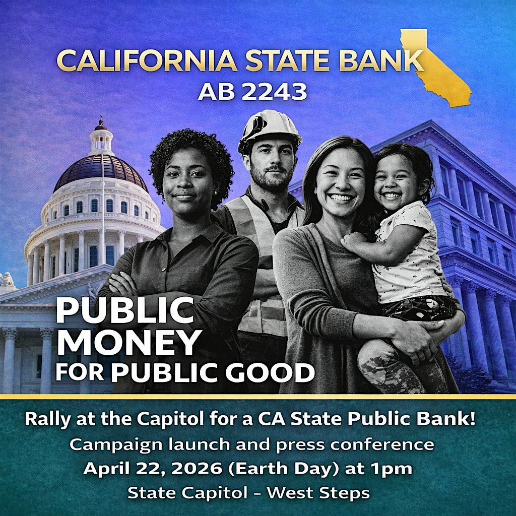 Join us at 12:30 pm on the West Steps of the State Capitol in Sacramento as we launch the CA State Public Bank (AB 2243) campaign with a press conference and coalition rally. Bill champions Assemblymembers Matt Haney and Ash Kalra will speak, along with six community leaders.