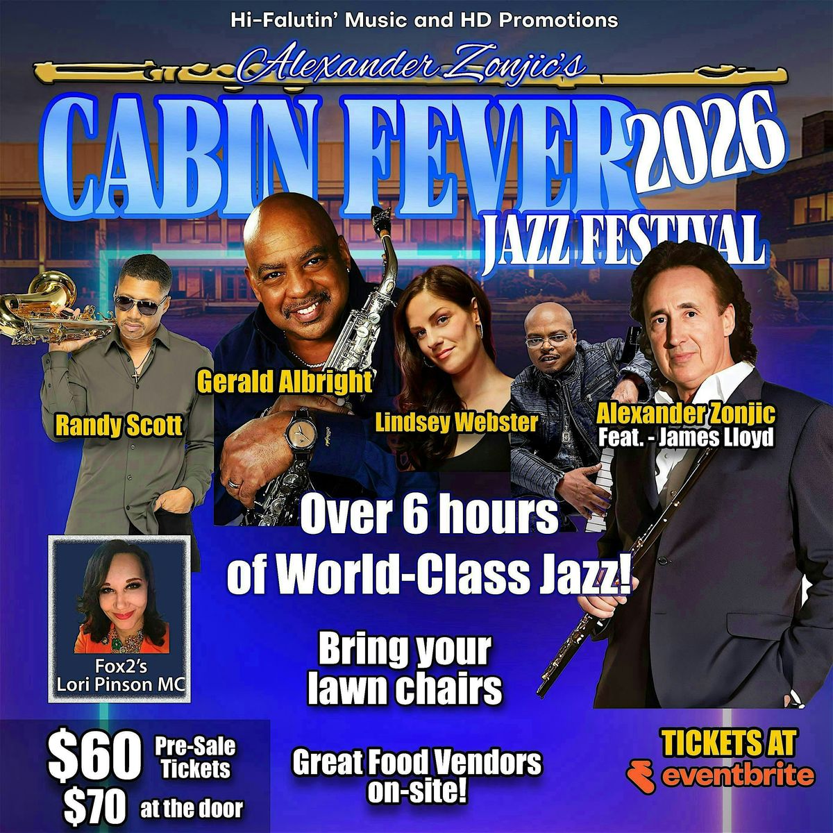 The 12th Annual Cabin Fever Jazz Festival. Just like our outdoor festivals, but indoors! Obver 6 hours of fantastic Jazz. Four great acts - Gerald Albright, Lindsey Webster, Randy Scott, and Alexander Zonjic and Friends featuring James Lloyd. Bring your own lawn chairs, food vendors on site. Plenty of free parking!