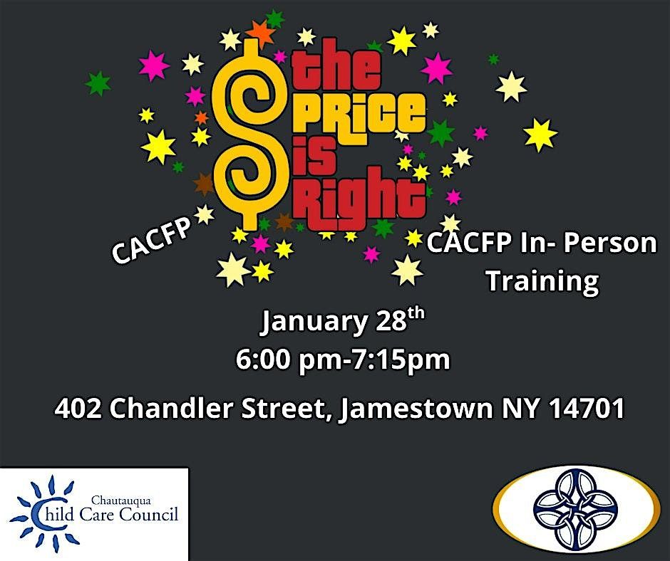 Hey there! Join us for an exciting training event titled CACFP THE PRICE IS RIGHT TRAINING at 402 Chandler St. Get ready to test your knowledge and have a blast!