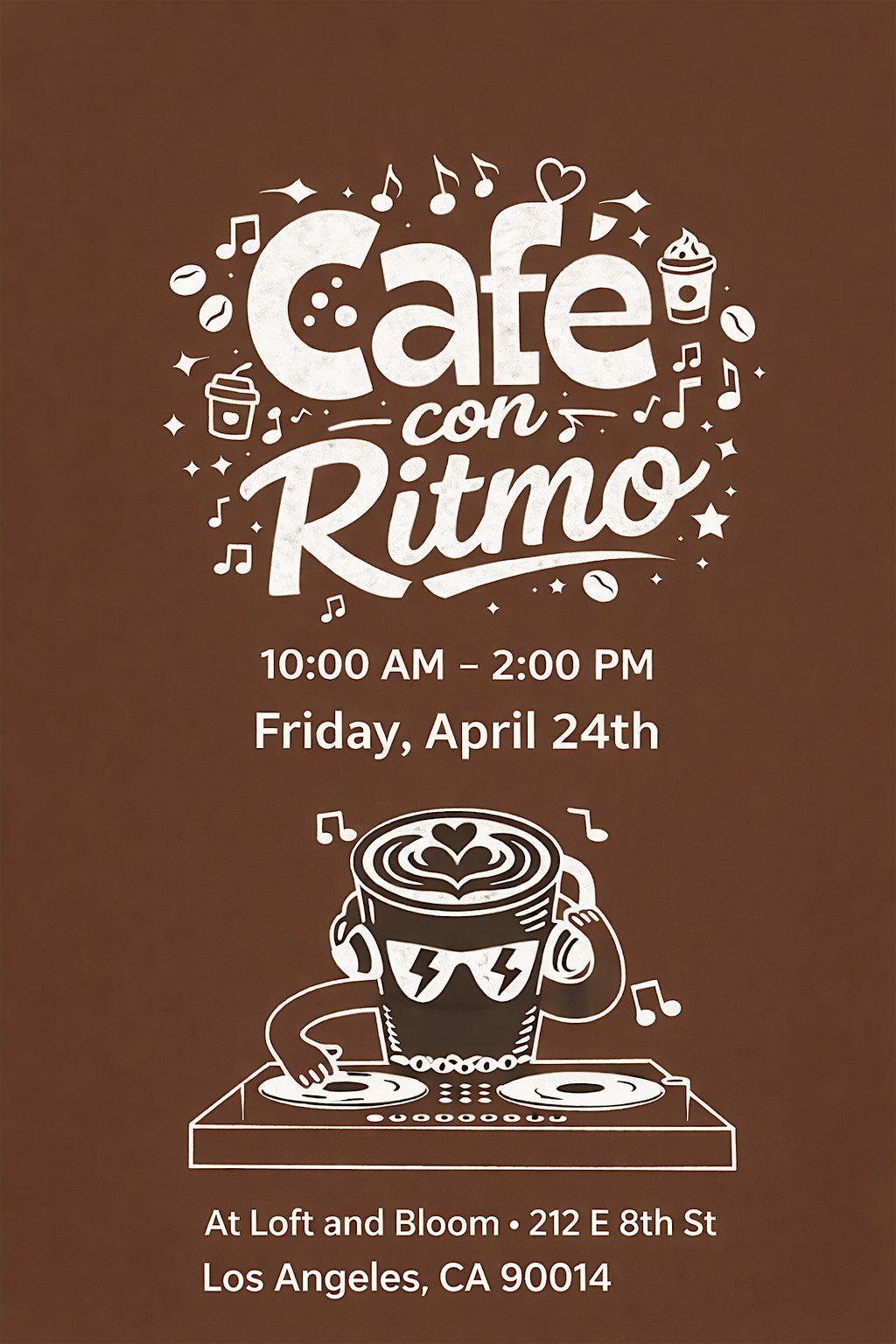 Join us for a chill morning at Loft and Bloom on April 24, 2026 at 10:00 AM . Come enjoy great vibes, tasty coffee, and awesome company. Whether you're here to relax, meet new friends, or just soak up the rhythm, this is the spot to be. Don't miss out on a fun, laid-back experience at Cafe Con Ritmo!