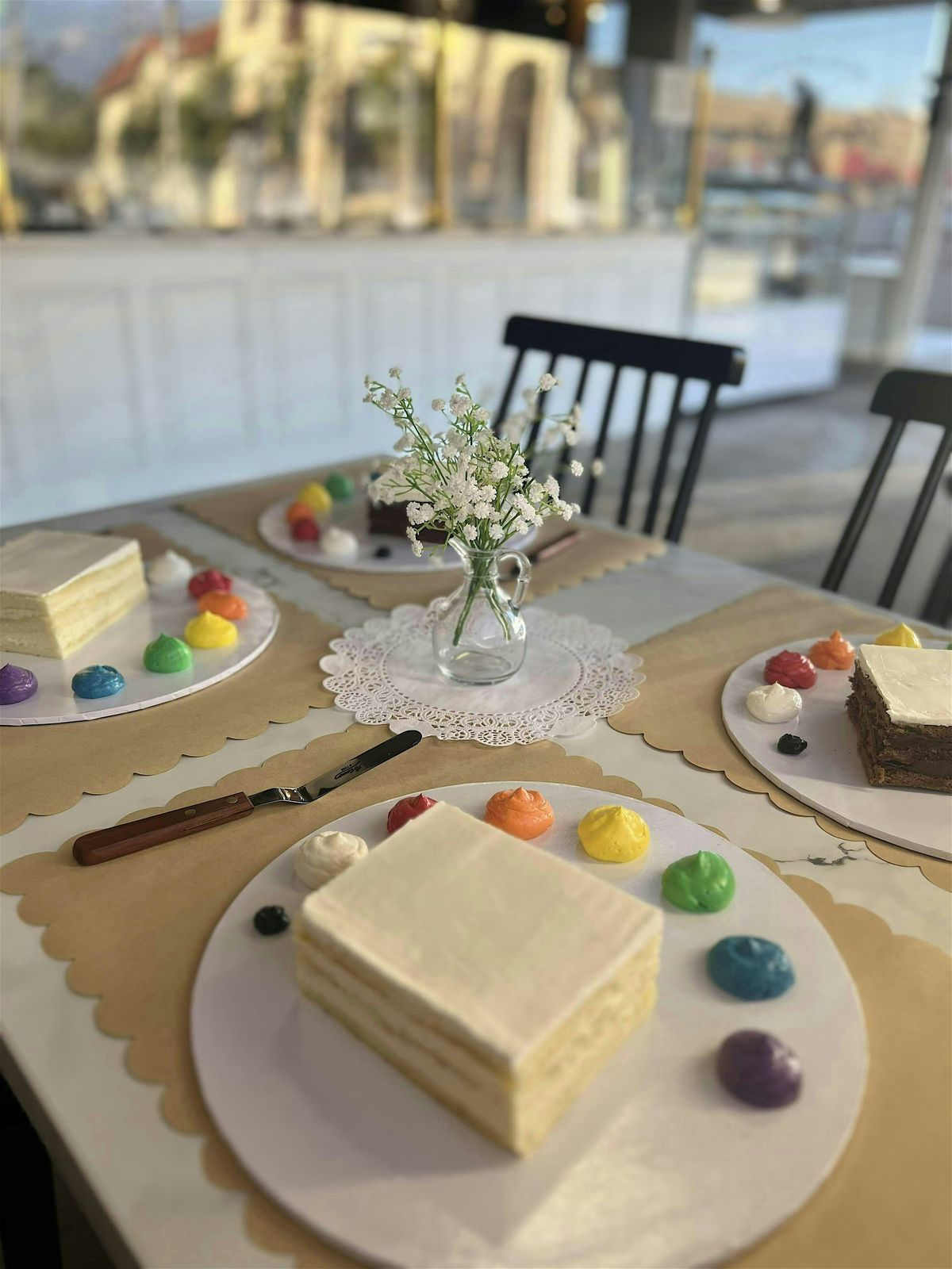 Guests recieve a blank frosted cake, a palette of colored buttercream, 2 complementary drinks of choice (coffee, tea, beer or wine) & take home your edible masterpiece!