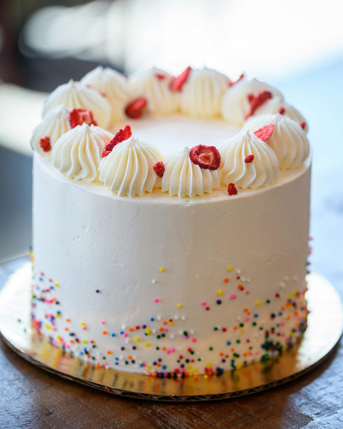 - Decorating with dried strawberries, sprinkles, and buttercream