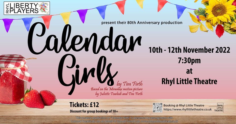 The multi-award-winning Rhyl Liberty Players are excited to announce their next production as the original stage adaptation of Tim Firth’s award-winning hit comedy film Calendar Girls. The poignant, funny and heart-warming play, based on the much-loved film starring Julie Walters and Helen Mirren, was inspired by the real-life story of the Women’s Institute branch in Rylstone, Yorkshire who posed for a cheeky but tasteful nude calendar to raise funds for Leukaemia.In 2022 we celebrate our 80th anniversary, and we’re delighted to celebrate by welcoming our regular audiences and new supporters back for this popular comedy. It’s the perfect play to fill the theatre with laughter, tears and the warm feeling of community only great Theatre can bring. We’re very excited to be back in the Little Theatre, which has been undergoing a major refurb and we know our audiences will love the improvements.