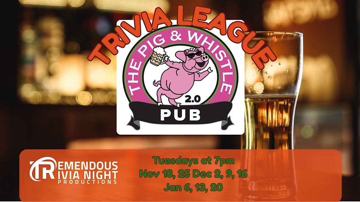 Trivia is Free to play with purchase - bring your team down for league trivia!The Pig & Whistle is BACK! Tremendous Trivia is proud to present Tuesday Night Trivia at the Pig & Whistle.Dive into our 6 rounds of trivia including 2 Name That Tune rounds, a themed visual round, and 3 rounds of general knowledge. work with your team to get the highest score and walk away with your head held high as our Winners of the Week - and some great prizes from the Pig and Whistle!Gather your friends, brush up on your trivia skills, and head on down to The Pig & Whistle Pub every Tuesday for a night of fun, food, and friendly competition.