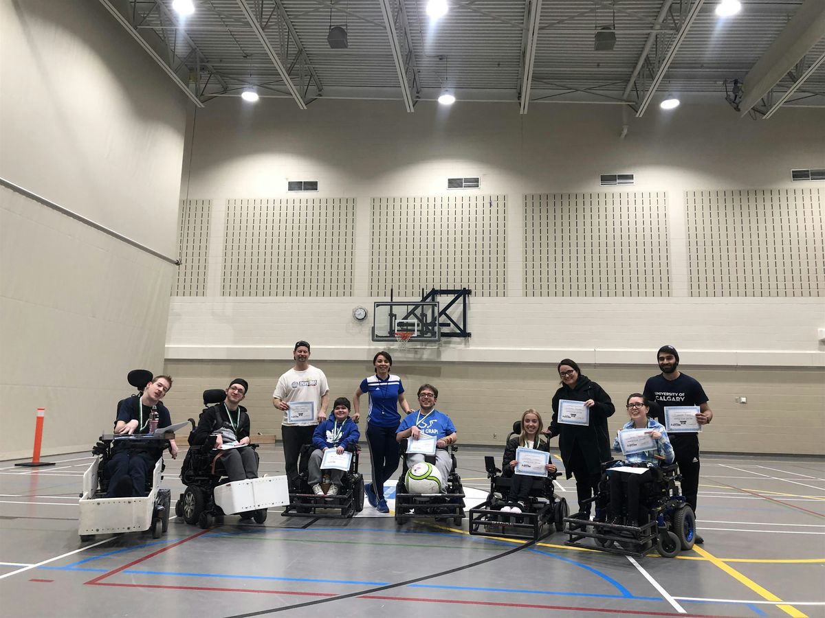 Plastic or metal footguards are attached to the front of power wheelchairs to maneuver a giant soccer ball. It is a fast paced sport that requires teamwork and skillful driving, which helps to build power-chair skills, dexterity and hand eye coordination.