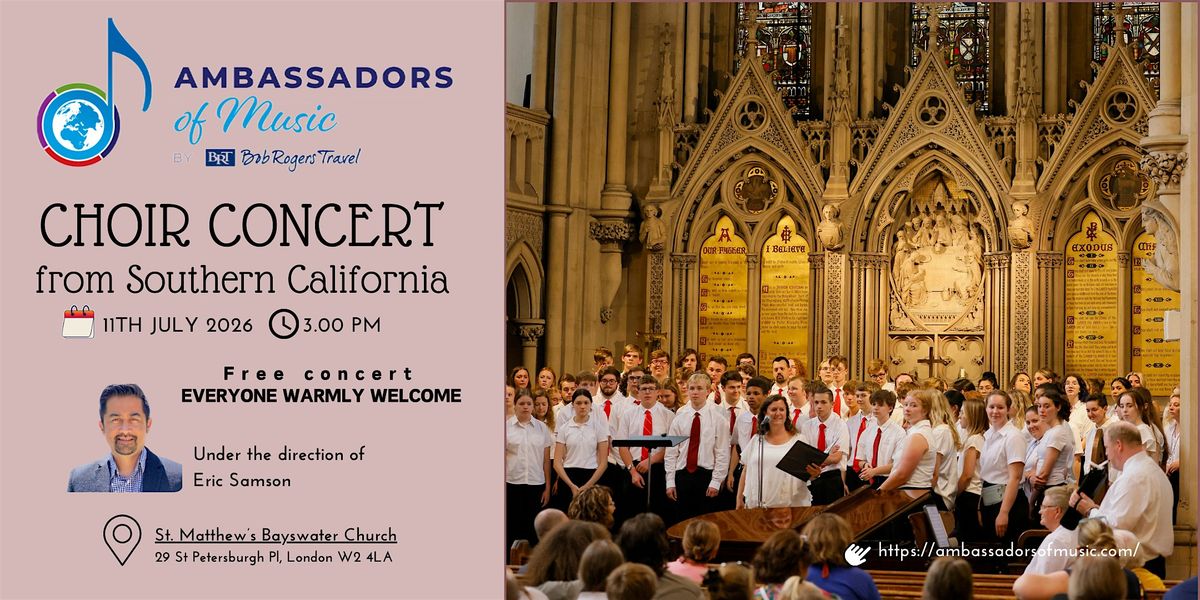 Join us for an amazing in-person performance by the Southern California Ambassadors of Music Choir at the beautiful St Matthew's Bayswater Church. Feel the energy and passion as the choir fills the space with uplifting melodies. This is a perfect chance to enjoy some soulful tunes and connect with other music lovers.