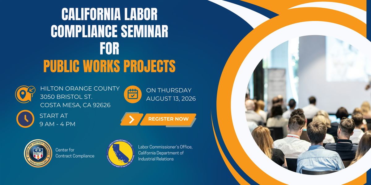Get up to speed on California’s labor compliance requirements for public works projects at this comprehensive, in-person seminar. Hosted by the Center for Contract Compliance in partnership with the Department of Industrial Relations, Labor Commissioner’s Office, this event brings industry experts together for a full day of education and connection at the Hilton Orange County Costa Mesa. Attendees will gain practical insight into current regulations, compliance expectations, and proven best practices. Designed for contractors, subcontractors, and public agency professionals, this seminar is an essential opportunity to stay informed and compliant in California’s public works environment.