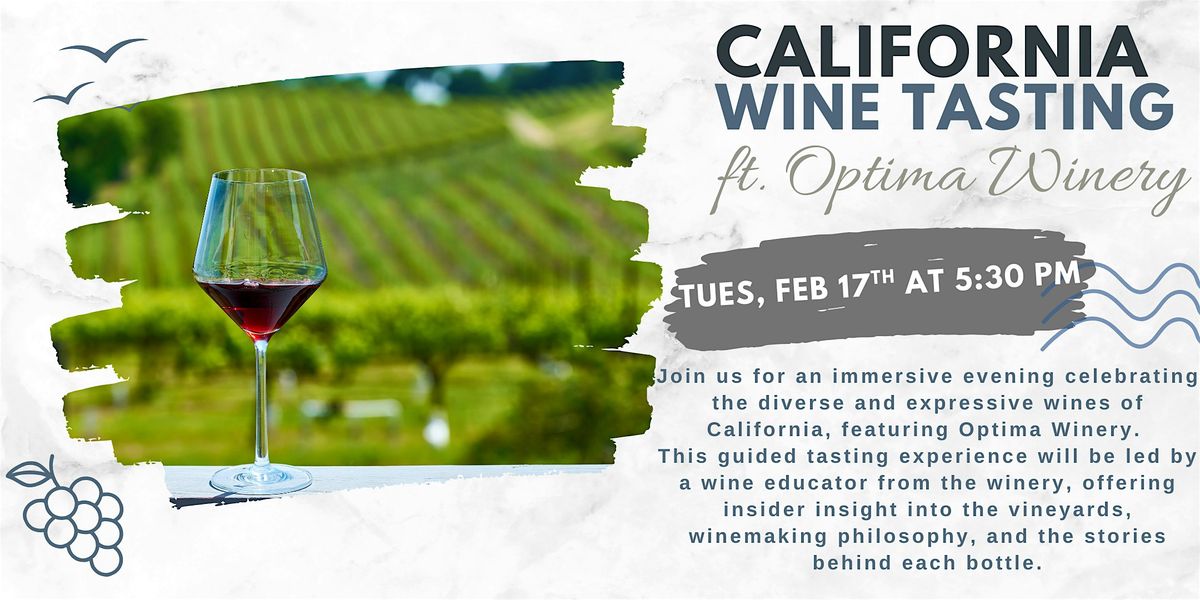 Join us for an immersive evening celebrating the diverse and expressive wines of California, featuring Optima Winery. This guided tasting experience will be led by a wine educator directly from the winery, offering insider insight into the vineyards, winemaking philosophy, and the stories behind each bottle.