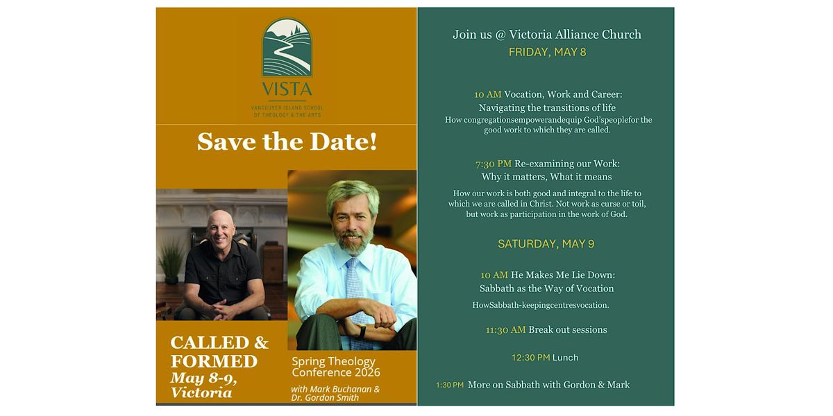 Discover a deeper purpose in your work and calling at Vocation, Work and Career: Navigating the Transitions of Life, a special conference hosted by Vista with Dr. Gordon Smith and Mark Buchanan. Together, we’ll explore how congregations can empower God’s people to embrace their daily work as sacred participation in the life and mission of Christ.