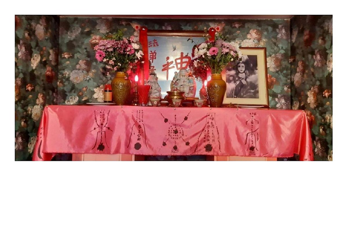 Yeu-Lai Mo’s practice is based in mixed media, installation, video and photography. Mo’s recent installation 'Upstairs', is a recreation of a shrine room that existed in above a Chinese Takeaway. Her family practiced Taoism and she recreated a large talisman made up of Fu sigils. These are lucky charms to ward off bad spirits or to seek good luck, peace and prosperity, especially at Lunar New Year.