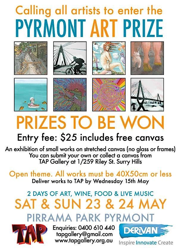 CALLING ALL ARTISTS TO PYRMONT ART PRIZE 2026 at Pirrama Park Pyrmont! Get ready to showcase your creativity and talent in this exciting TAP Gallery out door art exhibition. Join us on Sat May 23rd and Sun May 24th 2026 at 11:00 AM for 2 days filled with art, wine, food and live music. Entries to be small works on stretched canvas (40 x 50 cm or less) (no glass or frames) Open theme. Entry $25 includes a free canvas (collect from TAP Gallery 259 Riley St, Surry Hills) or submit your own. Deliver to TAP gallery by 20th May between 12-6 pm. Sponsored by Derivan and PRIZES to be won.
